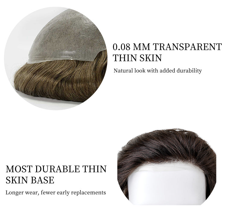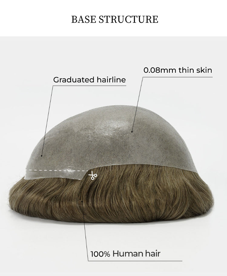 The 0.08mm base offers a slightly firmer feel compared to ultra-thin skin systems, providing added confidence during daily wear while maintaining a smooth, scalp-like appearance.